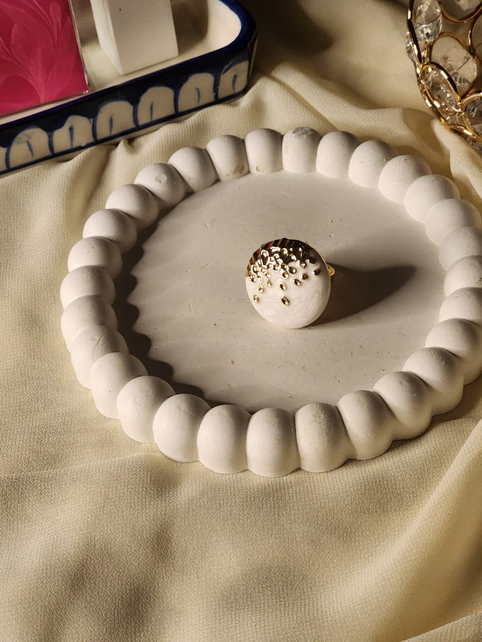 Experience the perfect balance of geometry and luxury with our Gold-Dripped Alabaster Dome Ring. Combining a clean white marbled base with bold, irregular gold metallic details, this sculptural piece is a sophisticated addition to any high-fashion collection.