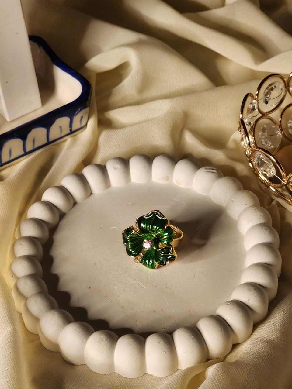 A mesmerizing, nature-inspired statement ring featuring handcrafted deep emerald green petals with a polished gold finish and shimmering crystal centers. Perfect for adding a sophisticated touch of color to any occasion.