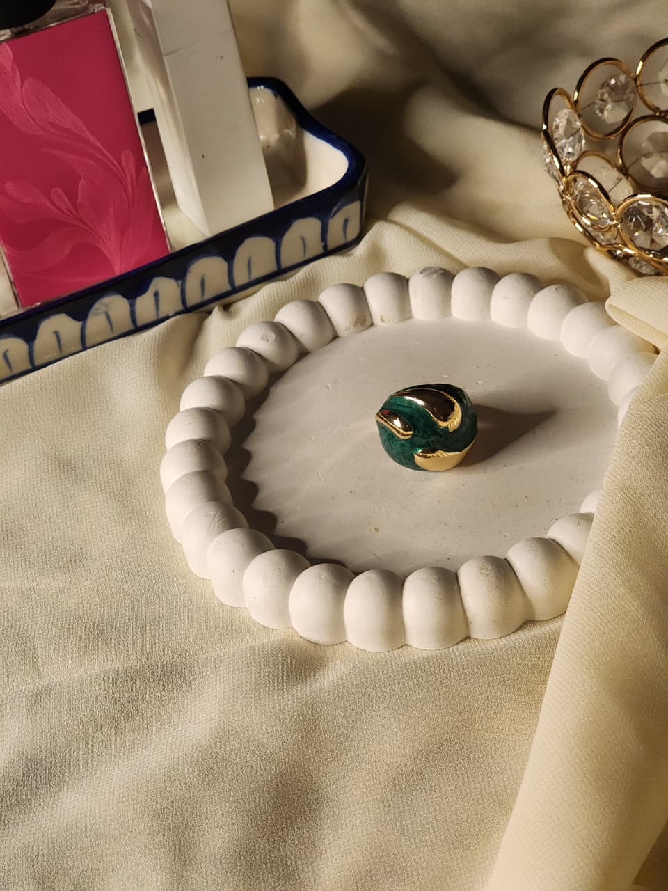 A high-angle shot of a bold dome-shaped statement ring featuring a deep emerald green malachite texture with swirling polished gold inlays, displayed on a white beaded decorative tray.