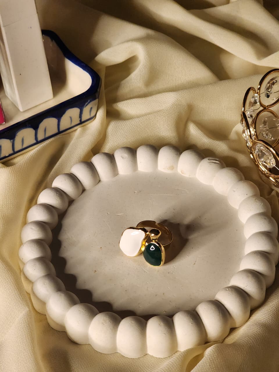 A modern, sculptural duo-shape statement ring featuring handcrafted abstract forms of pure white and deep malachite green set on a lustrous, polished gold finish base. An art-inspired, contemporary piece that brings sophisticated elegance to your daily or evening look.