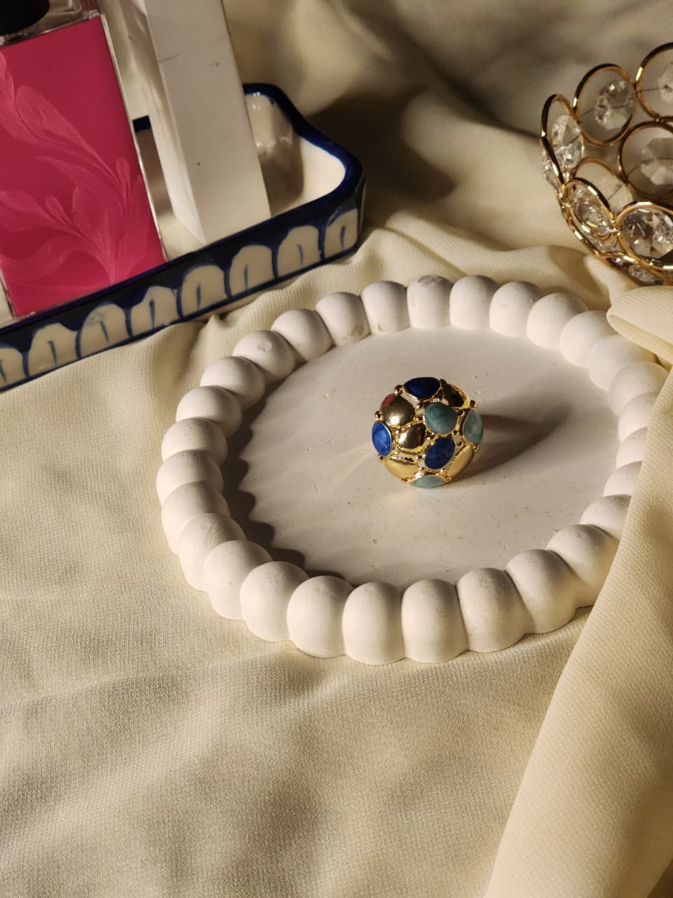 Midnight Azure Mosaic Dome Ring – Multi-Tonal Blue and Gold Design