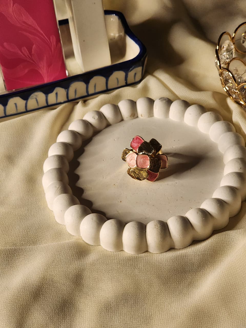 A top-down shot of a gold-finish statement ring featuring a cluster of textured gold petals and smooth pink enamel petals on a white decorative tray.